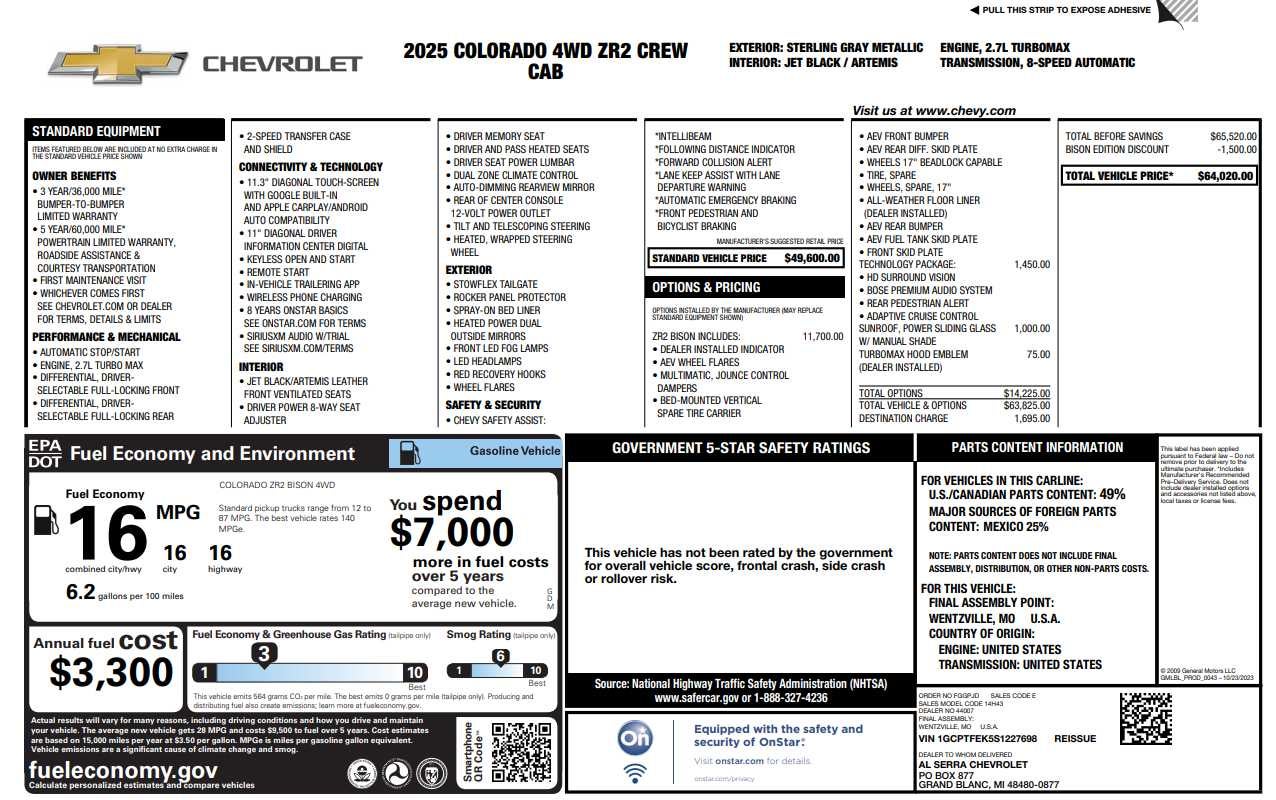 ZR2 BISON EDITION includes (VHU) AEV Stamped-steel Front Bumper, (VQH) AEV Heavy Duty Stamped-steel Rear Bumper with integrated recovery points, (PZ9) AEV fuel tank skid plate, (PZN) AEV transfer case skid plate, (PZL) AEV rear differential skid plate, (PZG) Front Skid Plates (radiator and steering gear), AEV hot-stamped Boron steel, (QTE) LT315/70R17 blackwall 35" OD MT tires, (RPE) 17" Beadlock capable carbon flash metallic wheels with AEV center cap, (VKV) AEV wheel flares, (RWF) Multimatic Jounce Control Dampers, (SKA) 17" Beadlock capable carbon flash metallic spare wheel, (P1D) Bed-Mounted Vertical Spare Tire Carrier, (RD8) LT315/70R17 blackwall 35" OD MT spare tire, (RIA) All-weather floor liner, with AEV logo, LPO, AEV branded front head restraints, Black AEV and Colorado exterior, TECHNOLOGY PACKAGE includes (KSG) Adaptive Cruise Control, (UKK) Rear Pedestrian Alert and (UV2) HD Surround Vision (Includes (UQA) Bose Premium Audio System.), POWER SLIDING GLASS WITH MANUAL SHADE, TURBOMAX (310 hp [231 kW] @ 5600 rpm, 430 lb-ft of torque [583 Nm] @ 3000 rpm) (STD), 8-SPEED AUTOMATIC (STD).